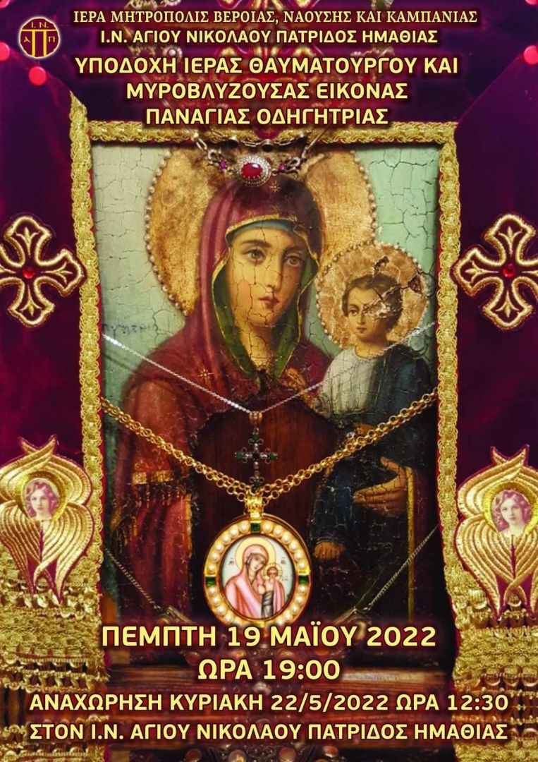 Πανηγυρίζει το Αγίασμα του Αγίου Νικολάου στην Πατρίδα Ημαθίας, για την εορτή ανακομιδής των Λειψάνων του Αγίου Νικολάου. Με αφορμή την πανήγυρη θα γίνει υποδοχή λειψάνου του Αγίου Νικολάου και η Εικόνα της Παναγίας Οδηγήτριας της Μυροβλίζουσας. Τα λείψανα και η εικόνα θα παραμείνουν στο Ναό από το απόγευμα της Πέμπτης (19/5/2022)έως και την Κυριακή(22/5/2022) το μεσημέρι.