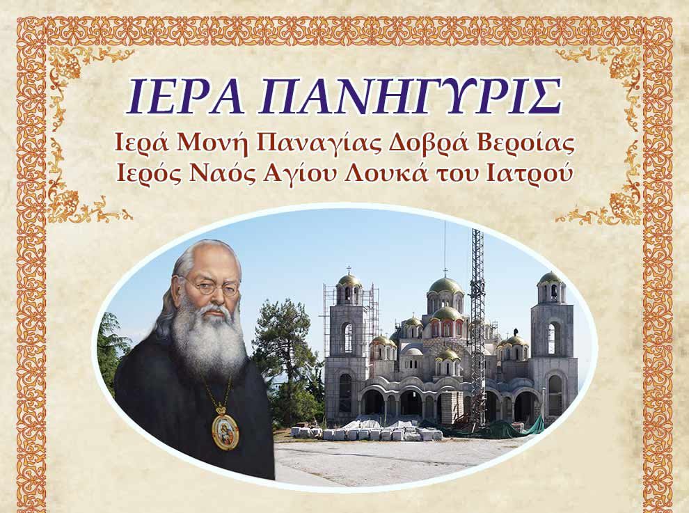 To διήμερο 10 και 11 Ιουνίου η Ιερά Μονή Παναγίας Δοβρά Βεροίας πανηγυρίζει την οσιακή κοίμηση του Αγίου Λουκά του Ιατρού, Αρχιεπισκόπου Συμφερουπόλεως του Θαυματουργού στον υπό κατασκευή Ιερό Ναό του, σύμφωνα με το παρακάτω πρόγραμμα: