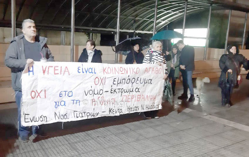 Παρά τη συνεχή βροχή η συγκέντρωση διαμαρτυρίας της Ένωσης Νοσοκομειακών Γιατρών Ημαθίας και του Νομαρχιακού Τμήματος της ΑΔΕΔΥ πραγματοποιήθηκε το απόγευμα της Πέμπτης 1 Δεκεμβρίου 2022 στην Πλατεία Δημαρχείου της Βέροιας, ζητώντας να μην περάσει το νομοσχέδιο για την Υγεία, το οποίο μεταξύ άλλων, δίνει τη δυνατότητα απασχόλησης γιατρών του ΕΣΥ στον ιδιωτικό τομέα και προβλέπει την προκήρυξη θέσεων γιατρών Ε.Σ.Υ., με καθεστώς μερικής απασχόλησης. «Τα μέτρα που προωθούνται με αυτό το νομοσχέδιο, όχι μόνο δεν πρόκειται να βελτιώσουν τους όρους περίθαλψης των ασθενών, αλλά θα τους επιδεινώσουν