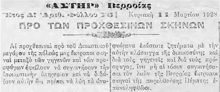 Δεν έλειψαν λοιπόν και στον τόπο μας οι σπινθήρες “ανάφλεξης αντεγκλήσεων και εκτρόπων” μεταξύ γηγενών και προσφύγων, με κορύφωση τους σοβαρούς διαπληκτισμούς μπροστά στο Δικαστικό Μέγαρο στις αρχές του Μαρτίου 1928, μετά από την έκδοση σειράς ακυρωτικών αποφάσεων επί συμβολαίων αγοροπωλησίας αγροτεμαχίων, που ωστόσο είχαν πριν τη σύναψή τους τη θετική εισήγηση των αρμοδίων υπηρεσιών.