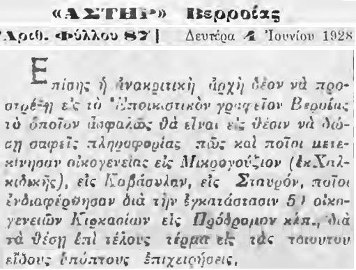 Σ’ αυτά προστέθηκαν: η τοπικά αποκαλούμενη “σπείρα των αεριτζήδων” (Αστήρ Βερροίας Αρ.Φ. 88 / 13 Ιουνίου 1928), η οποία «…λυμαίνεται ούκ ολίγους των ενοικιαστών των ανταλλαξίμων κτημάτων, εκθέτουσα εις δημοπρασίαν τα υπ’ αυτής κατεχόμενα και αποσυρόμενη κατόπιν, αφού πρότερον “τσιμπήση” τον σχετικόν αέρα από τον ενδιαφερόμενον ενοικιαστήν (πρόσφυγα)…» και κάποιες αστοχίες (μερικές εκ των οποίων προκάλεσαν δεικτικές συζητήσεις για τις αγαθές προθέσεις) υπαλλήλων του Γραφείου Εποικισμού.