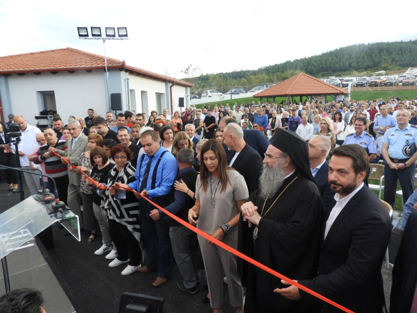Μετά το αγιασμό κόπηκε, με τρία ψαλίδια, η κόκκινη κορδέλα των εγκαινίων από τον Θεοφιλέστατο Επίσκοπο κ. Χριστοφόρο, την υπουργό Σοφία Ζαχαράκη και την πρόεδρο των «Παιδιών της Άνοιξης» Νόρα Σαρκατζή.
