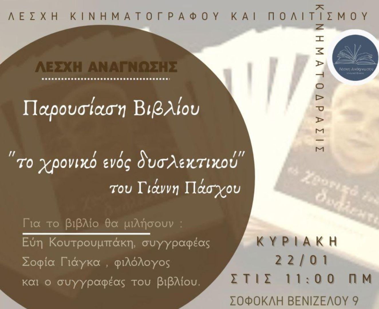 Η Λέσχη Ανάγνωσης της Λέσχης Κινηματογράφου και Πολιτισμού Αλεξάνδρειας σας προσκαλεί στην παρουσίαση του βιβλίου «Το χρονικό ενός δυσλεκτικού» του Γιάννη Πάσχου.