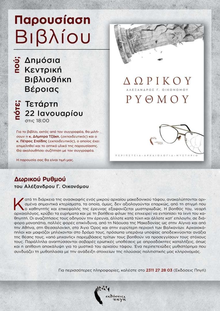 Οι εκδόσεις Πηγή και ο συγγραφέας Αλέξανδρος Οικονόμου σας προσκαλούν στην παρουσίαση του νέου ιστορικού μυθιστορήματός του με τίτλος “Δωρικού ρυθμού”.