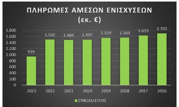 Συγκεκριμένα, οι Άμεσες Ενισχύσεις που πιστώθηκαν στους λογαριασμούς των δικαιούχων (σύμφωνα με τις ανακοινώσεις του ΟΠΕΚΕΠΕ) για το 2023 ανέρχονται σε € 939 εκ., δηλαδή € 563 εκ. λιγότερα σε σχέση με το 2022.