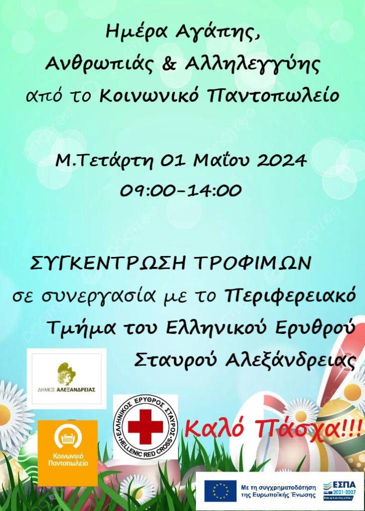 Ο Δήμος Αλεξάνδρειας μέσω του Κοινωνικού Παντοπωλείου της Διεύθυνσης Κοινωνικής Προστασίας Παιδείας και Πολιτισμού του Δήμου Αλεξάνδρειας, σε συνεργασία με το Περιφερειακό Τμήμα του Ελληνικού Ερυθρού Σταυρού, εν όψει των άγιων ημερών του Πάσχα, συνδιοργανώνουν δράση με σκοπό τη συγκέντρωση τροφίμων για τους συμπολίτες μας που στερούνται βασικών ειδών διατροφής με τίτλο “Ημέρα Αγάπης, Ανθρωπιάς και Αλληλεγγύης».