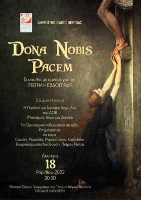 Το Δημοτικό Ωδείο Βέροιας διοργανώνει την Πασχαλινή Συναυλία «DONA NOBIS PACEM», με έργα για τη Μεγάλη Εβδομάδα, τη Δευτέρα 18 Απριλίου, ώρα 20.00, στο Θέατρο της Αντωνιάδειου Στέγης Γραμμάτων και Τεχνών