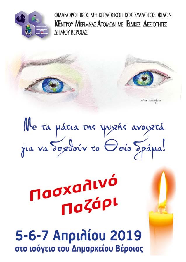 Ο Φιλανθρωπικός μη Κερδοσκοπικός Σύλλογος Φίλων Κέντρου Μέριμνας ΑμΕΑ Βέροιας σας προσκαλεί στο Πασχαλινό Παζάρι των Χειροτεχνημάτων που κατασκευάζονται από τους νέους μας στα εργαστήρια του Κέντρου.