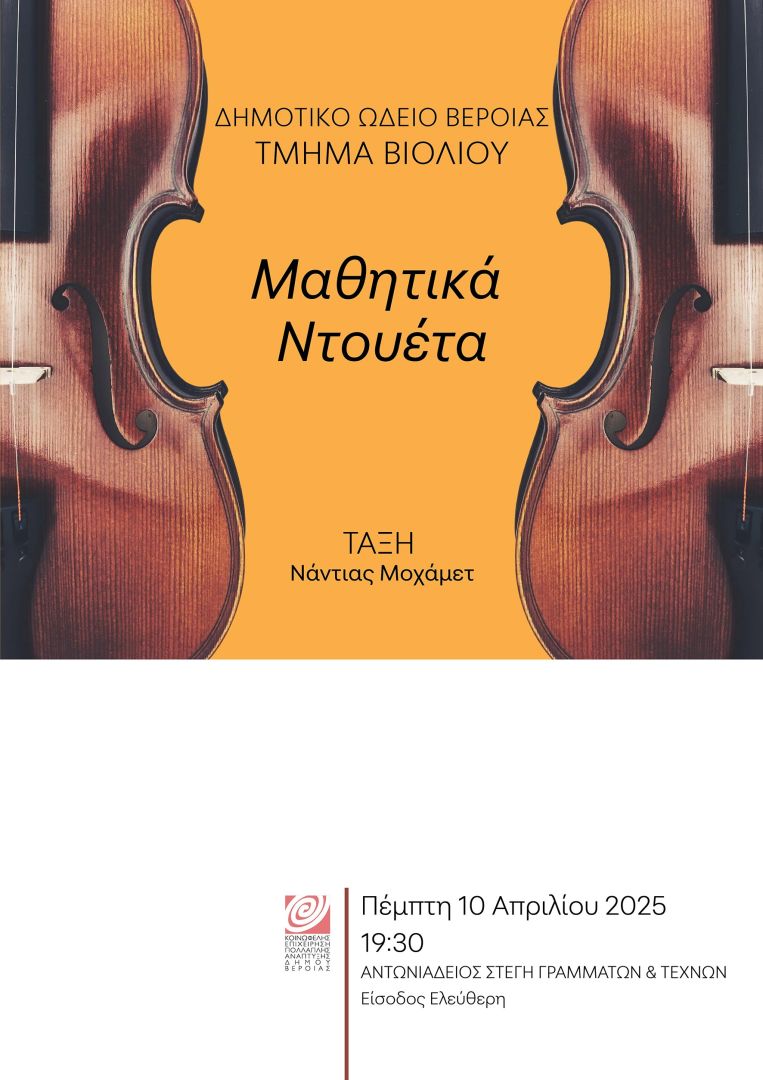 «Μαθητικά ντουέτα» είναι ο τίτλος της συναυλίας που δίνουν μαθητές Τμημάτων του Δημοτικού Ωδείου της ΚΕΠΑ Δ. Βέροιας, την Πέμπτη 10 Απριλίου 2025 στην Αντωνιάδειο Στέγη Γραμμάτων και Τεχνών, στις 7.30 μ.μ.