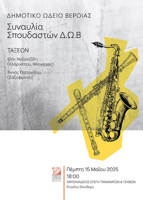 Με την ολοκλήρωση της φετινής εκπαιδευτικής χρονιάς στο δημοτικό Ωδείο της ΚΕΠΑ Δ. Βέροιας, οι μαθητές των τάξεων του Ιβάν Ναβροζίδη και της Άννας Παπανίδου, θα παρουσιάσουν κλασσικά έργα, για κλαρινέτο, φλογέρα και σαξόφωνο.