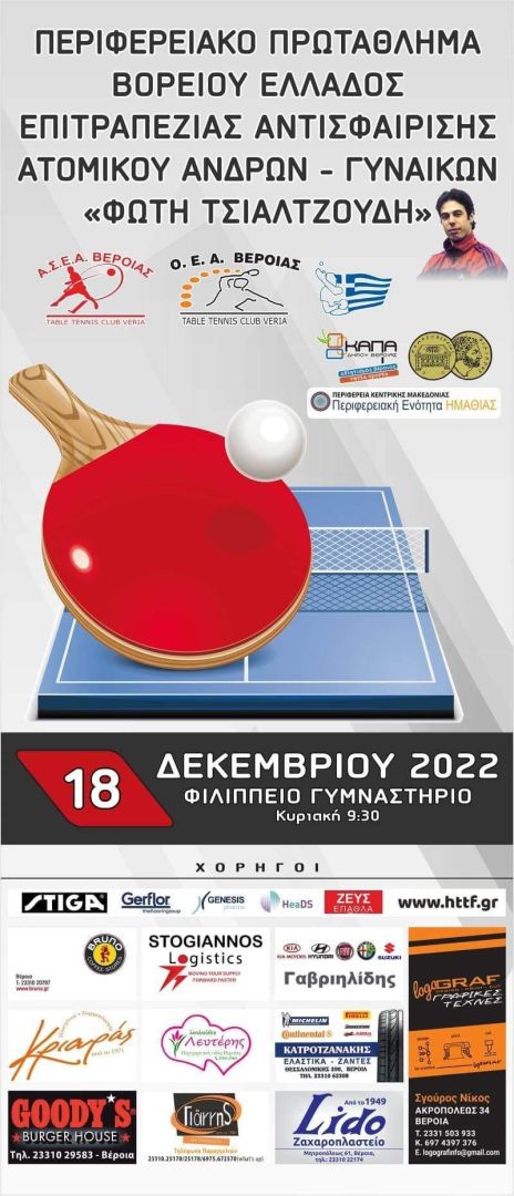 Οι Σύλλογοι ΑΣΕΑΒ και ΟΕΑΒ της Επιτραπέζιας Αντισφαίρισης Βέροιας σας προσκαλούν στις 18 Δεκέμβρη ημέρα Κυριακή στο Περιφερειακό Πρωτάθλημα Βορείου Ελλάδος Ατομικού Ανδρών – Γυναικών, που θα διεξαχθεί στο Φιλλίπειο Κλειστό Γυμναστήριο Βέροιας, στις 09:30.
