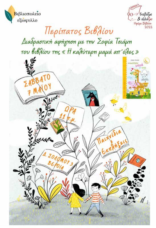 Το βιβλίο της «Η καλύτερη μαμά απ΄όλες», θα αφηγηθεί η συγγραφέας Σοφία Τσιάμη στο πλαίσιο της δράσης ΠΕΡΙΠΑΤΟΣ ΒΙΒΛΙΟΥ που θα γίνει το Σάββατο 7 Μάϊου 2022 στις 11.00 το πρωί, στο Βιβλιοπωλείο «Εξώφυλλο» της Βέροιας, στον πεζόδρομο της οδού Δ. Σολωμού.