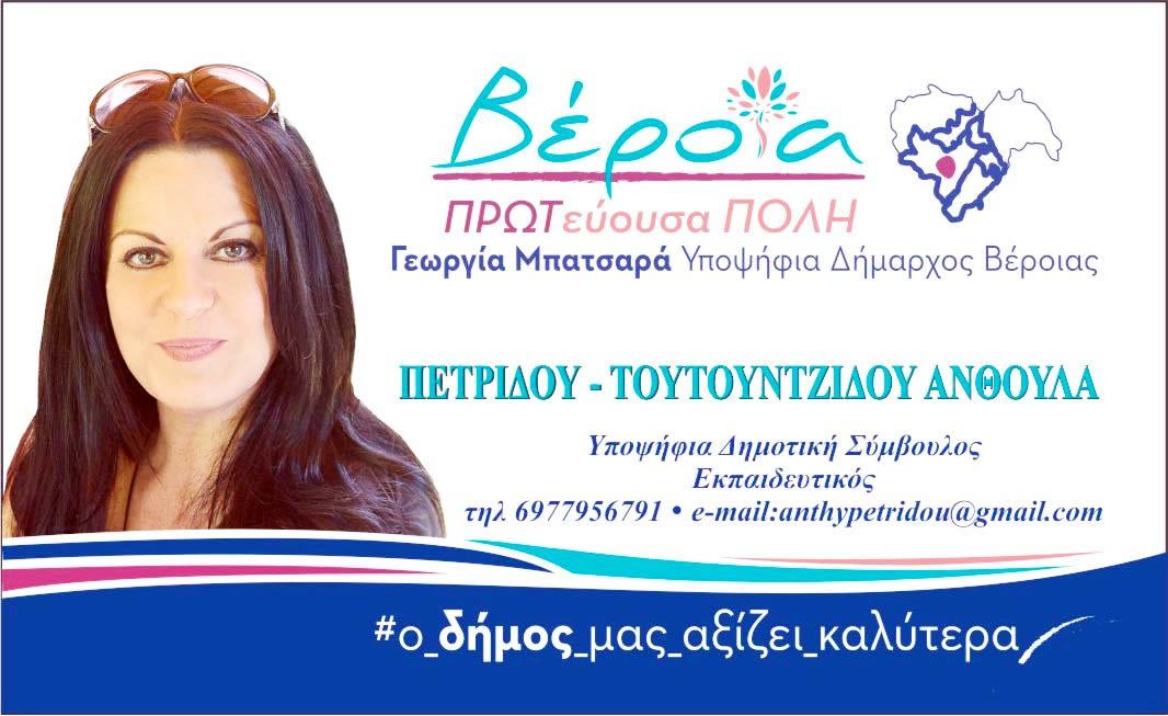 Ονομάζομαι Πετρίδου-Τουτουντζίδου Ανθούλα και είμαι εκπαιδευτικός. Θα ήθελα να σας γνωστοποιήσω ότι στις Δημοτικές Εκλογές του Μαΐου θα είμαι υποψήφια Δημοτική Σύμβουλος με το συνδυασμό Βέροια ΠΡΩτεύουσα πόλη, επικεφαλής του οποίου είναι η κυρία Γεωργία Μπατσαρά.