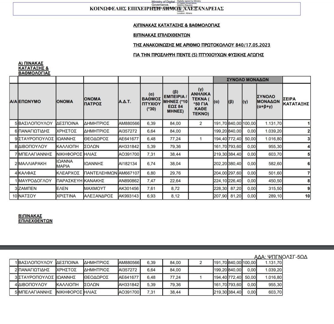 Ανακοινώνονται από την Κοινωφελή Επιχείρηση του Δήμου Αλεξάνδρειας τα ονόματα των επιλεχθέντων για την πρόσληψη 5 πτυχιούχων Φυσικής Αγωγής για την κάλυψη αναγκών για τη λειτουργία του Δημοτικού Κολυμβητηρίου για την κολυμβητική περίοδο του 2023.