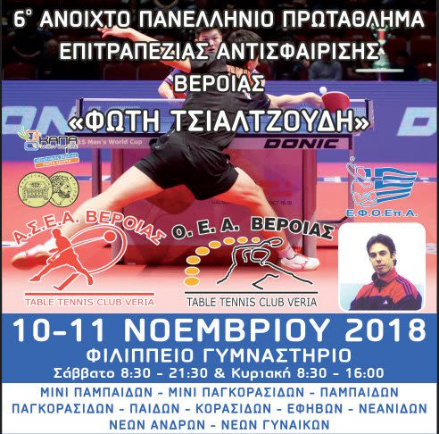 Με τη σημαντική ανταπόκριση, που μαρτυρά ο μεγάλος και φέτος αριθμός συμμετοχών και με τις εξαιρετικές προϋποθέσεις, που δημιουργούν οι αγωνιστικές συνθήκες, η Βέροια ετοιμάζεται για το 6ο πανελλήνιο τουρνουά της στις μικρές ηλικίες. Μόλις επτά μήνες ύστερα από το αντίστοιχο της περιόδου 2017-2018 νιώθει πάλι τη γλυκιά προσμονή να υποδεχτεί, να φιλοξενήσει και ν’ αναδείξει το αύριο της επιτραπέζιας αντισφαίρισης.