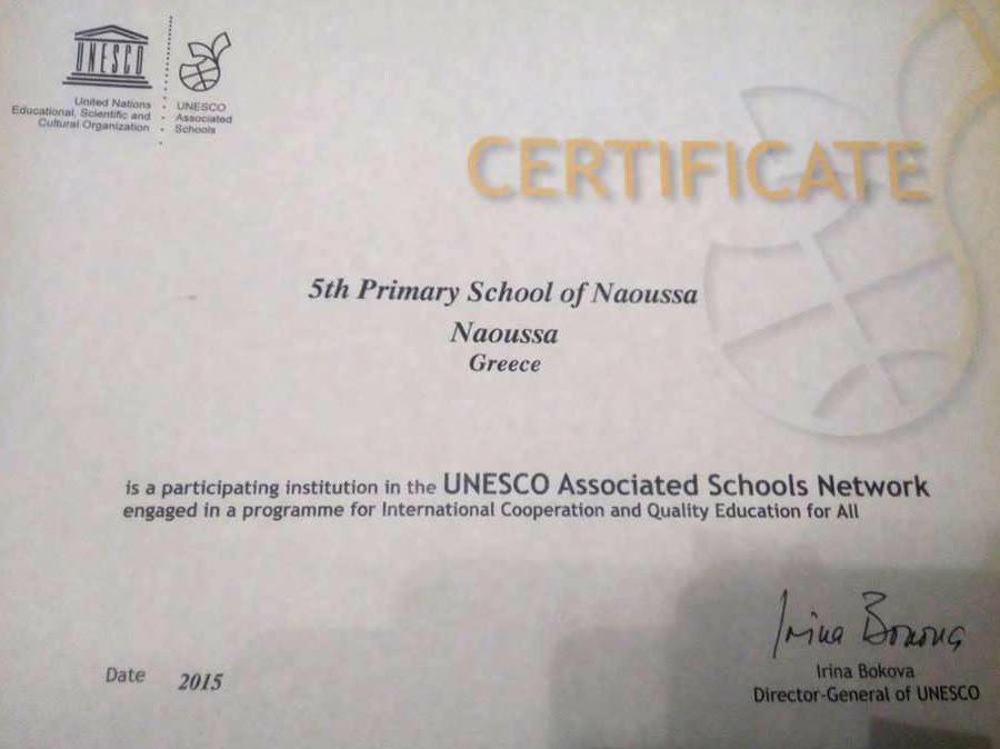 Πιστοποιητικό συνεργαζόμενου σχολείου με την Unesco παρέλαβε από το ΥΠ.Π.Ε.Θ. το 5ο ΔΣ Νάουσας, μετά από τρία χρόνια δράσεων (2015-2018), που σχετίζονται με τους στόχους της Εκπαίδευσης για την Αειφόρο Ανάπτυξη που έχει θέσει η Unesco.