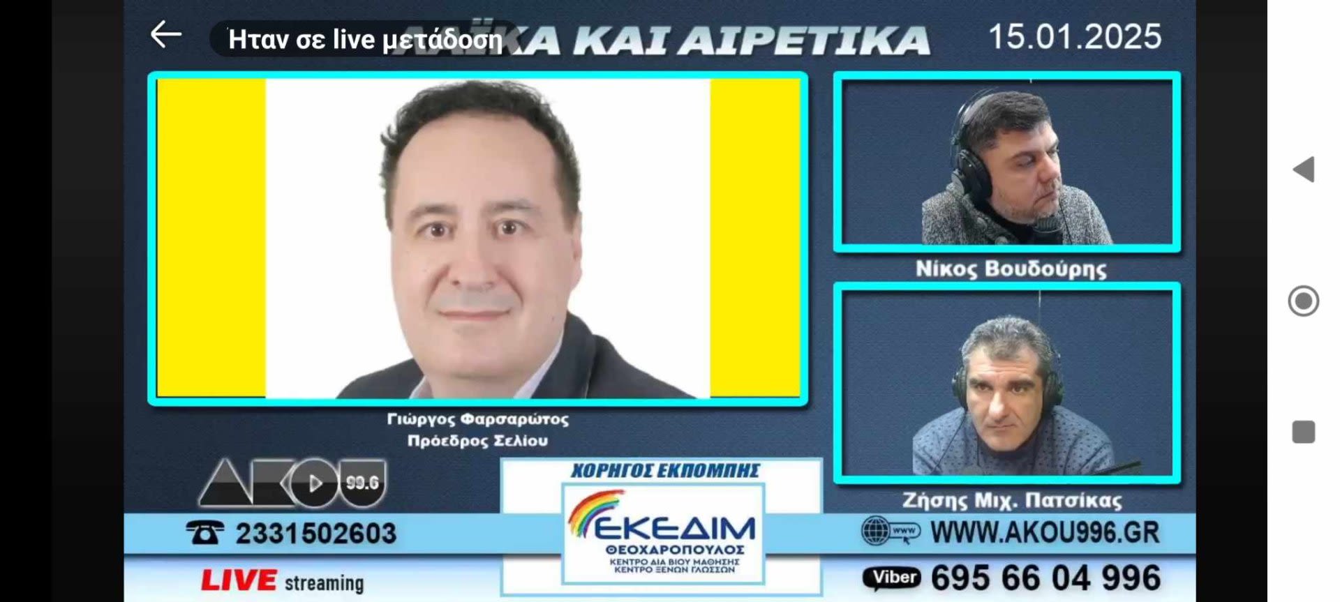 Στην πρώτη εκπομπή για το 2025, προσκεκλημένος στα «Λαϊκά&Αιρετικά» του ΑΚΟΥ 99,6 με τους Ζήση Μιχ. Πατσίκα και Νίκο Βουδούρη, ήταν ο πρόεδρος της κοινότητας Σελίου Γιώργος Φαρσαρώτος.