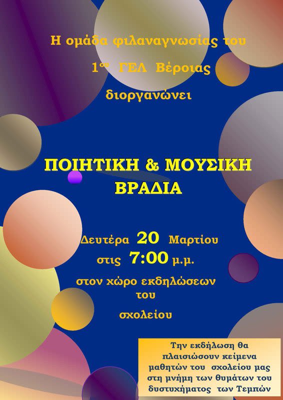 φιλαναγνωσίας του 1ου ΓΕΛ Βέροιας διοργανώνει ποιητική και μουσική βραδιά τη Δευτέρα 20