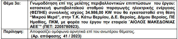 Να θυμίσουμε ότι ομόφωνα αρνητικό ήταν και το Δημοτικό Συμβούλιο Βέροιας, στην συνεδρίαση της 8ης Μαΐου 2023, το θέμα συζητήθηκε παρουσία και κατοίκων του Σελίου, που σύσσωμοι αντιδρούν έντονα στην κατασκευή αυτού του έργου, δίπλα στα σπίτια τους. Ενώ ανάλογη αρνητική γνωμοδότηση είχε προηγηθεί και στην συνεδρίαση της Επιτροπής Διαβούλευσης και της Επιτροπής Ποιότητας Ζωής του δήμου Βέροιας.