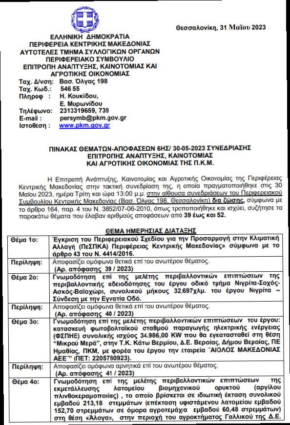 Με ομόφωνη απόφαση(41/2023) το μεσημέρι της Τρίτης(30/5) το περιφερειακό συμβούλιο Κεντρικής Μακεδονίας γνωμοδότησε αρνητικά στην κατασκευή φωτοβολταϊκού πάρκου στο Σέλι, πολύ κοντά στο χωριό και στο χιονοδρομικό, σε έκταση του συνεταιρισμού ‘Μικρού Μερά’. Το με αριθμό 3 θέμα, που αφορούσε την μελέτη περιβαλλοντικών επιπτώσεων συζητήθηκε στη συνεδρίαση και απορρίφθηκε από όλες τις παρατάξεις. Εισηγητής στην αρμόδια επιτροπή ήταν ο περιφερειακός σύμβουλος, Στέργιος Μουρτζίλας, ενώ καθοριστικός ήταν ο ρόλος του προέδρου της Επιτροπής, αντιπεριφερειάρχη Ανάπτυξης και Περιβάλλοντος, Κωνσταντίνου Γιουτίκα, γνωστού Σελιώτη με σπίτι στο χωριό.