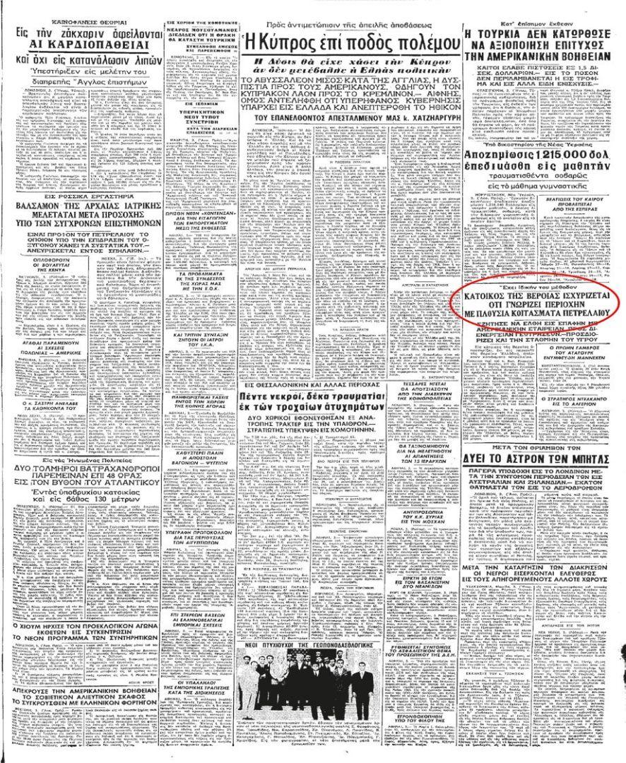 Εζήτησε να έλθη εις επαφήν με αμερικανικήν εταιρείαν, προς διενέργειαν γεωτρήσεων. – Προσδιορίζει και την στάθμην του υγρού