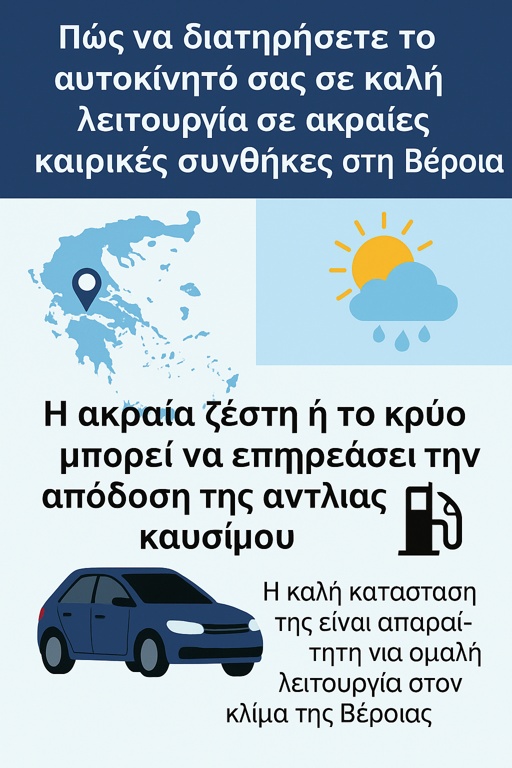 Η Βέροια, με το ποικίλο κλίμα της, μπορεί να αποτελέσει πρόκληση για τους ιδιοκτήτες αυτοκινήτων. Η ακραία ζέστη το καλοκαίρι και το δριμύ κρύο το χειμώνα μπορούν να επιβαρύνουν την απόδοση του οχήματός σας. Είτε οδηγείτε μέσα σε χιονοθύελλες είτε αντιμετωπίζετε υψηλές θερμοκρασίες, η κατανόηση του τρόπου με τον οποίο οι διαφορετικές καιρικές συνθήκες επηρεάζουν το αυτοκίνητό σας μπορεί να κάνει μεγάλη διαφορά στη διατήρηση της ομαλής λειτουργίας του. Ένα κρίσιμο εξάρτημα που μπορεί να επηρεαστεί τόσο από την ακραία ζέστη όσο και από το κρύο είναι η αντλία καυσίμου. Σε αυτό το άρθρο, θα συζητήσουμε πώς να διασφαλίσετε ότι το όχημά σας είναι έτοιμο για κάθε καιρική συνθήκη, με ιδιαίτερη έμφαση στο σύστημα καυσίμου.