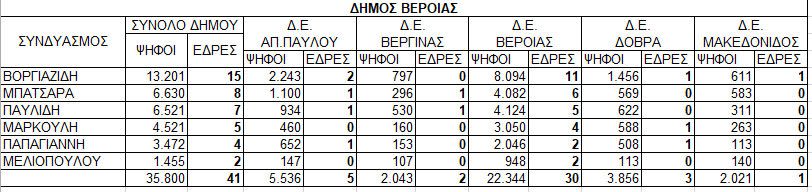 Π. Παυλίδης 7 έδρες: 5 στη Βέροια, 1 στον Απ. Παύλου και 1 στη Βεργίνα