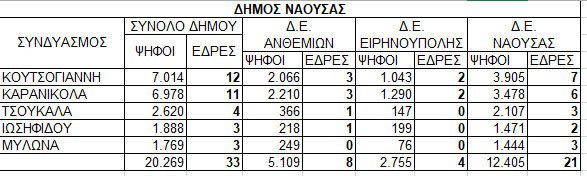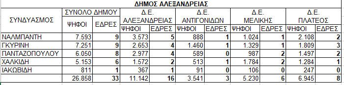 Κατά το εκλογικό μέτρο κατανέμονται και οι έδρες στους Δήμους Νάουσας και Αλεξάνδρειας. Χαρακτηριστικοί είναι οι παρακάτω πίνακες με την έγκυρη υπογραφή του επιστημονικού συνεργάτη της ΠΕΔ κ. Απόστολου Ιωσηφίδη. Στο αυριανό μας φύλλο αποτελέσματα, ονόματα και έδρες για την Περιφέρεια.