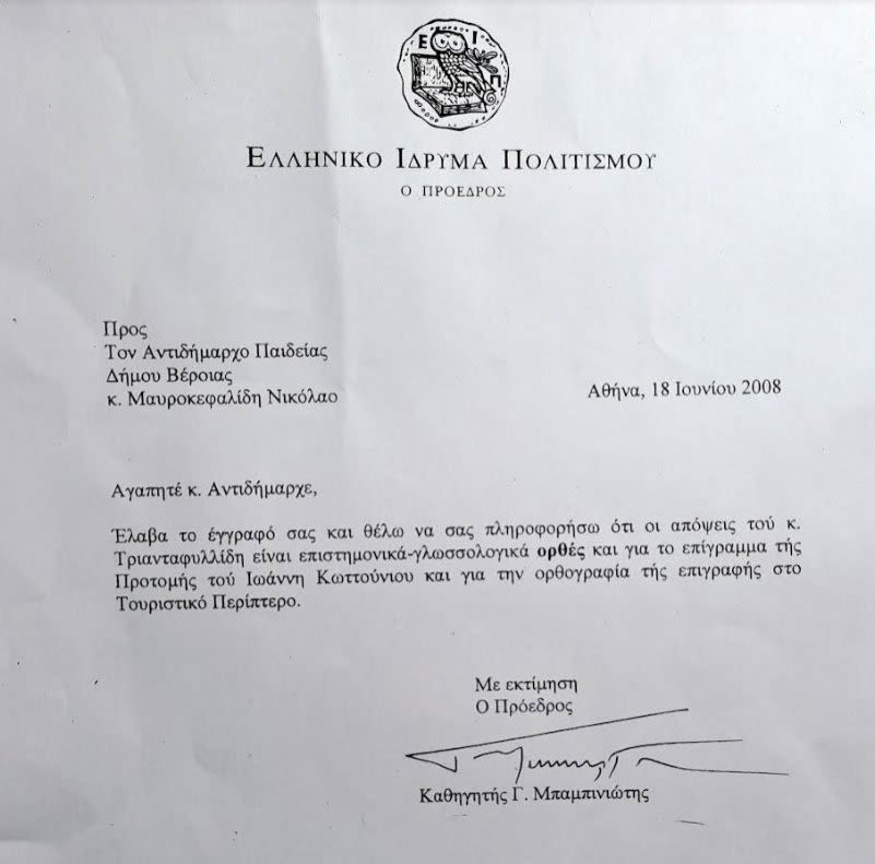 Έλαβα το έγγραφό σας και θέλω να σας πληροφορήσω ότι οι απόψεις του κ. Τριαταφυλλίδη είναι επιστημονικά-γλωσσολογικά ορθές (το «ορθές» με πιο μεγάλα γράμματα) και για το επίγραμμα της προτομής του Ιωάννη Κωττούνιου και για την ορθογραφία της επιγραφής του Τουριστικού Περιπτέρου».
