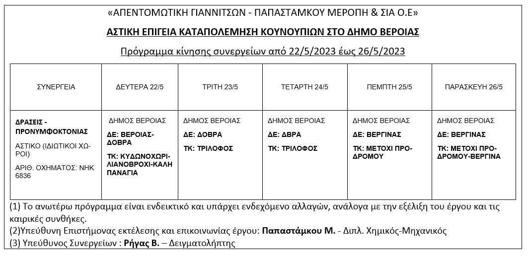 προσεχή εβδομάδα 22 – 26/5/2023 το συνεργείο του αναδόχου φορέα «ΑΠΕΝΤΟΜΩΤΙΚΗ