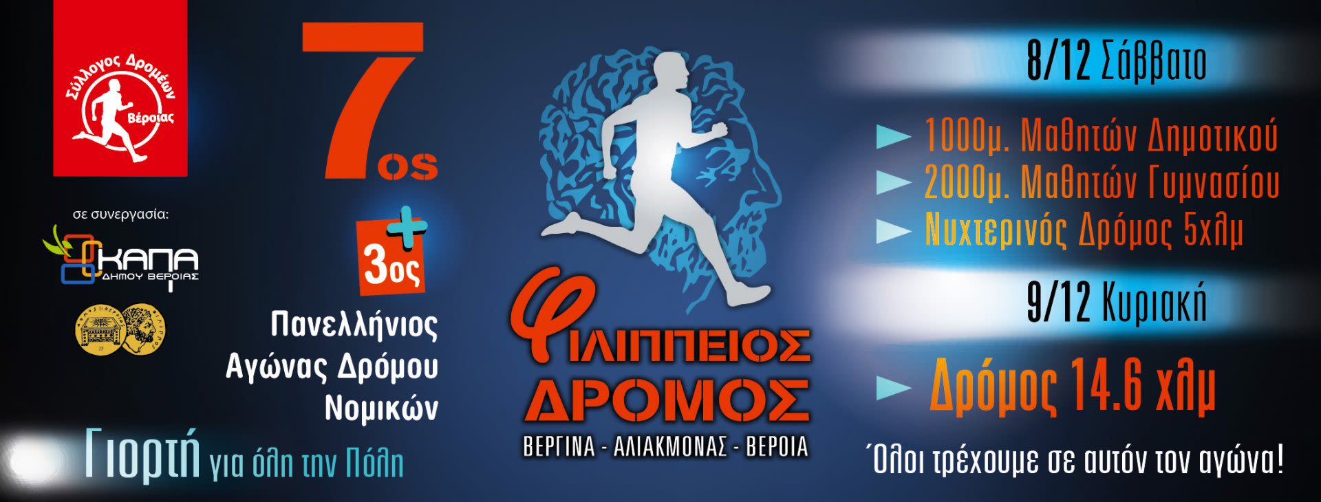 Ο Σύλλογος δρομέων Βέροιας και το Αθλητικό τμήμα του Κ.Α.Π.Α. Δήμου Βέροιας συνδιοργανώνουν τον λαϊκό αγώνα “7ο ΦΙΛΙΠΠΕΙΟ ΔΡΟΜΟ” 14.600μ (Αρχαιολογικός χώρος Βεργίνας – Φράγμα Αλιάκμονα – Δημαρχείο Βέροιας) και τους παράλληλους αγώνες 5000μ άνω των 15 ετών, 2000μ παιδιών Γυμνασίου, 1000μ παιδιών Δημοτικού Σχολείου.