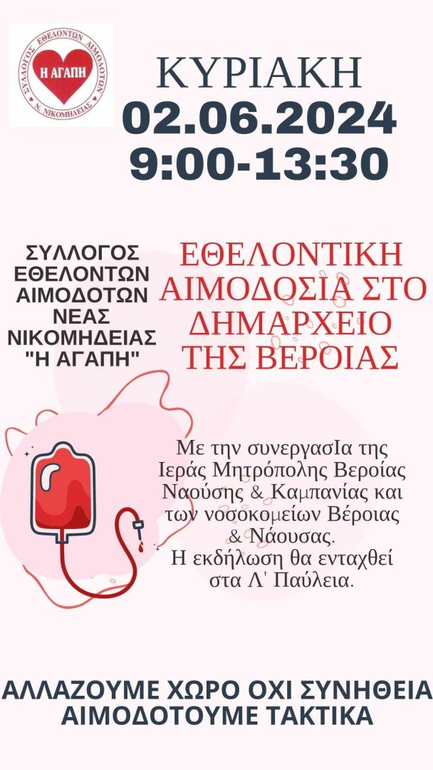 Σας καλούμε στην αιμοδοσία στις 2 ΙΟΥΝΙΟΥ 2024 ΚΥΡΙΑΚΗ και σας περιμένουμε με την υποστήριξη του Νοσοκομείου Βέροιας και Νάουσας.