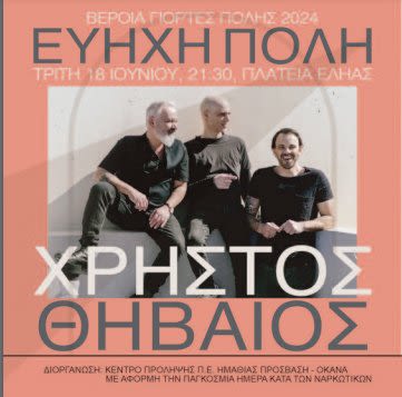 Εκδήλωση – μουσική συναυλία με τον Χρήστο Θηβαίο θα πραγματοποιηθεί με αφορμή την Παγκόσμια Ημέρα κατά των Ναρκωτικών σε συνεργασία με την ΚΕΠΑ Δήμου Βέροιας την Τρίτη 18 Ιουνίου 2024 στις 9.30 μ.μ. στην Πλατεία Εληάς.