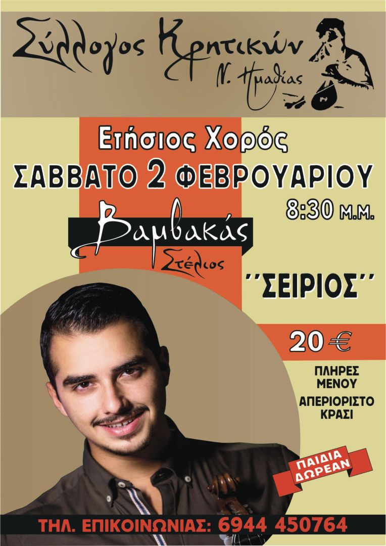 Ο Σύλλογος Κρητικών Νομού Ημαθίας σας προσκαλεί στον ετήσιο χορό του που θα πραγματοποιηθεί στις 2 Φεβρουαρίου 2019 στο κέντρο ΣΕΙΡΙΟΣ στο Μακροχώρι Ημαθίας.
