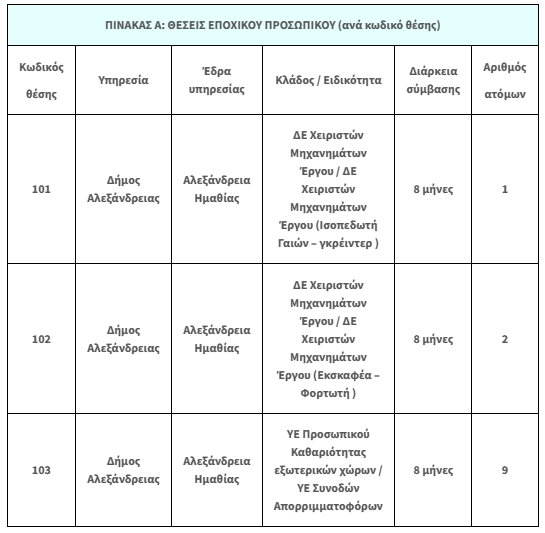 Την πρόσληψη, με σύμβαση εργασίας ιδιωτικού δικαίου ορισμένου χρόνου, συνολικά δώδεκα (12) ατόμων για την κάλυψη εποχικών ή παροδικών αναγκών του Δήμου Αλεξάνδρειας, που εδρεύει στην Αλεξάνδρεια της Περιφερειακής Ενότητας Ημαθίας και συγκεκριμένα τους εξής, ανά υπηρεσία, έδρα, ειδικότητα και διάρκεια σύμβασης, αριθμού ατόμων (βλ. ΠΙΝΑΚΑ Α):