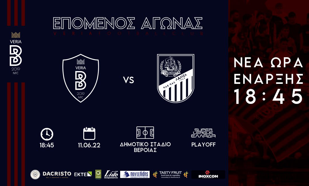 “Από την ΠΑΕ ΝΠΣ ΒΕΡΟΙΑ ανακοινώνεται ότι σύμφωνα με απόφαση της ΕΠΟ, η σέντρα του αγώνα μεταξύ ΝΠΣ ΒΕΡΟΙΑ και ΠΑΣ ΛΑΜΙΑ (Σάββατο 11/6, Δημοτικό Στάδιο Βέροιας), μετατίθεται για τις 18:45.”