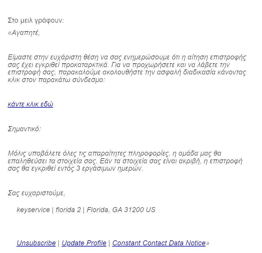 Το μειλ στάλθηκε και στον εμπορικό σύλλογο Βέροιας, που προφανώς είναι πιο υποψιασμένος από φυσικά πρόσωπα που μπορεί να την πατήσουν διαβάζοντας για επιστροφή…