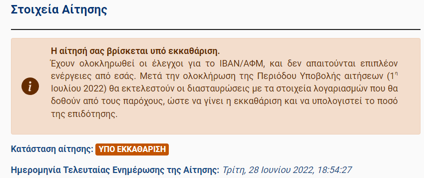 «Τα στοιχεία Κύριας κατοικίας έχουν τροποποιηθεί με αποτέλεσμα η κατάσταση της αίτησής σας να αλλάξει και να εκκρεμεί η υποβολή της. Παρακαλώ επιβεβαιώστε τα στοιχεία της αίτησης σας και προχωρήστε στην υποβολή της χρησιμοποιώντας το κουμπί υποβολή αίτησης».