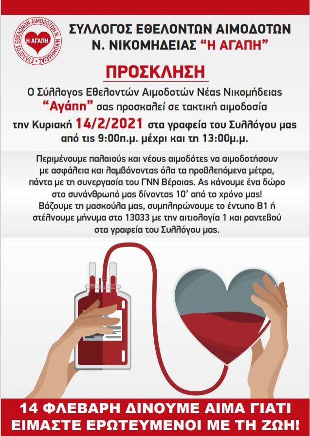 Νικομήδειας ” Η ΑΓΑΠΗ” καλεί τα μέλη του στην πρώτη τακτική αιμοδοσία