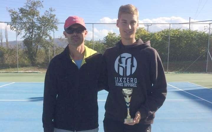 Ο Πρόεδρος του Ομίλου Αντισφαίρισης ΑΛΕΞΑΝΔΡΟΣ Βέροιας συγχαίρει τον αθλητή για την επιτυχία του και τον προπονητή του ομίλου ΚΟΥΚΟΥΛΟΜΑΤΗ ΣΤΑΥΡΟ.