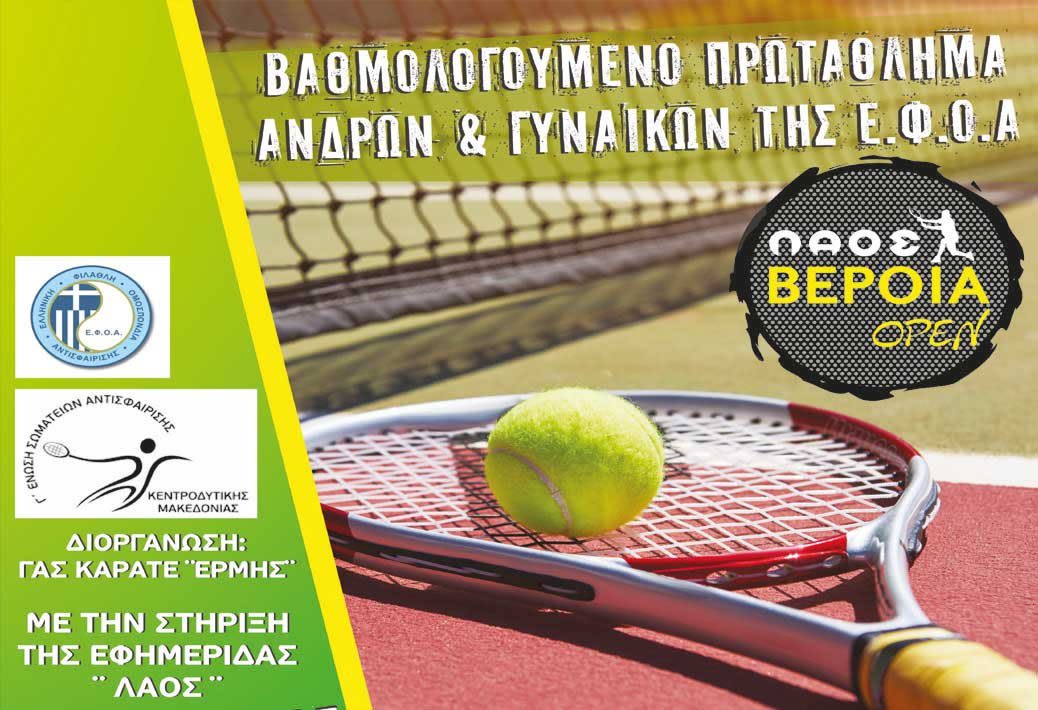 Ξεκινά σήμερα στις 10 το πρωί το βαθμολογούμενο τουρνουά τένις Ανδρών-Γυναικών «ΛΑΟΣ ΒΕΡΟΙΑ OPEN 2021», που διοργανώνεται από την Γ’ Ένωση Αντισφαίρισης Κεντροδυτικής Μακεδονίας και τον σύλλογο Γ.Α.Σ Καράτε Ερμής με την υποστήριξη της εφημερίδας ΛΑΟΣ, στα 5 green set γήπεδα του ΔΑΚ Μακροχωρίου Βέροιας και θα διαρκέσει μέχρι την Κυριακή 12 Σεπτεμβρίου.