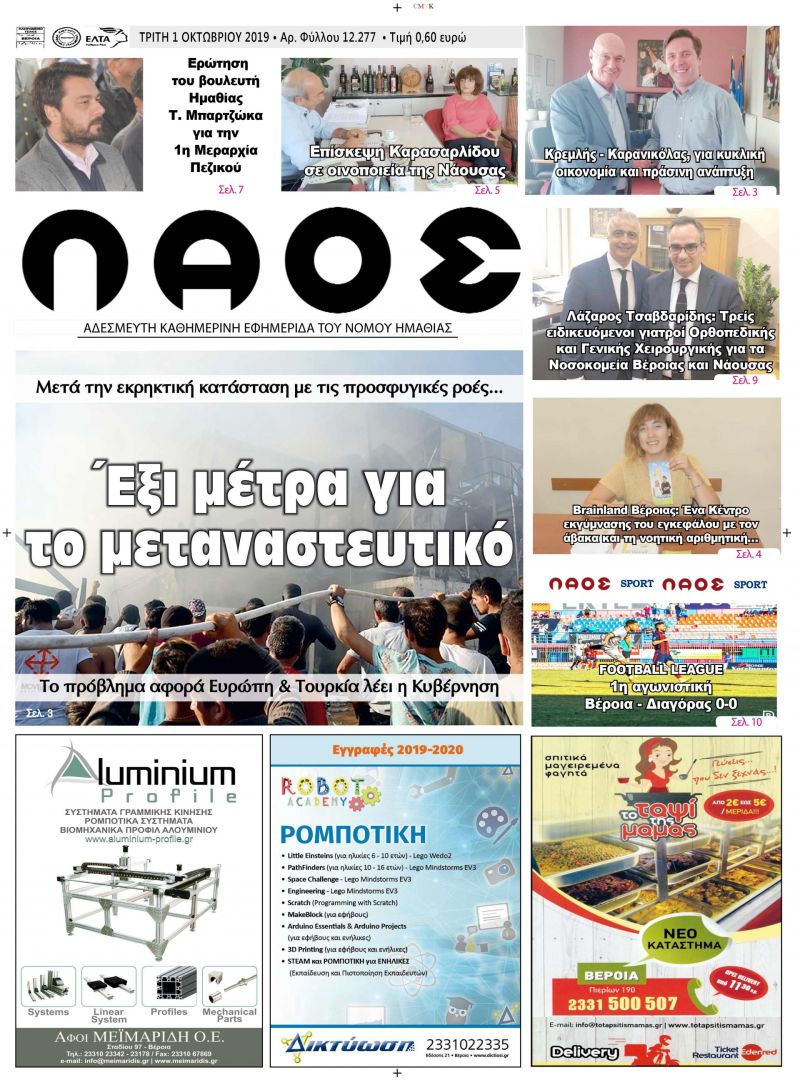 Πρωτοσέλιδο 1 ΟΚΤ. 2019