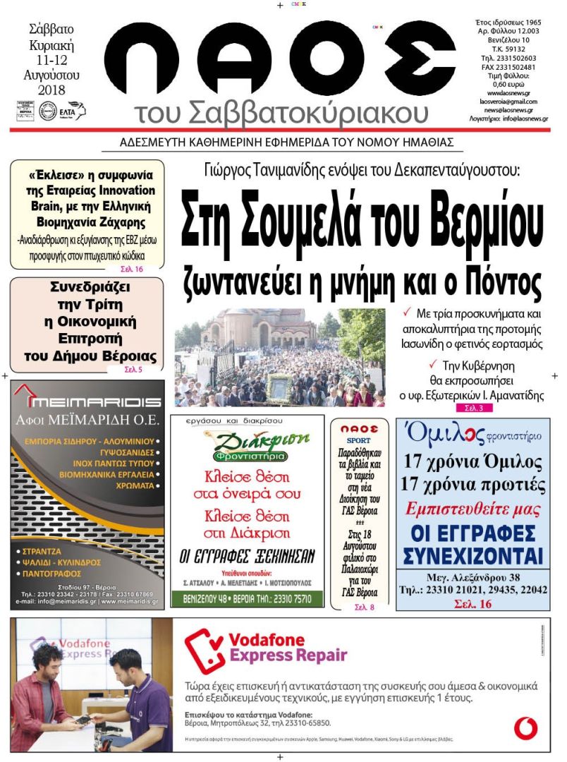 Πρωτοσέλιδο 11- 12 Αυγούστου 2018