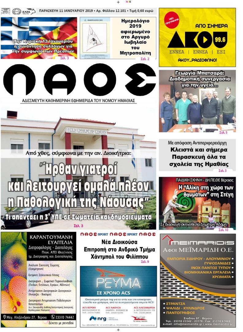 Πρωτοσέλιδο 11 Ιαν. 2019