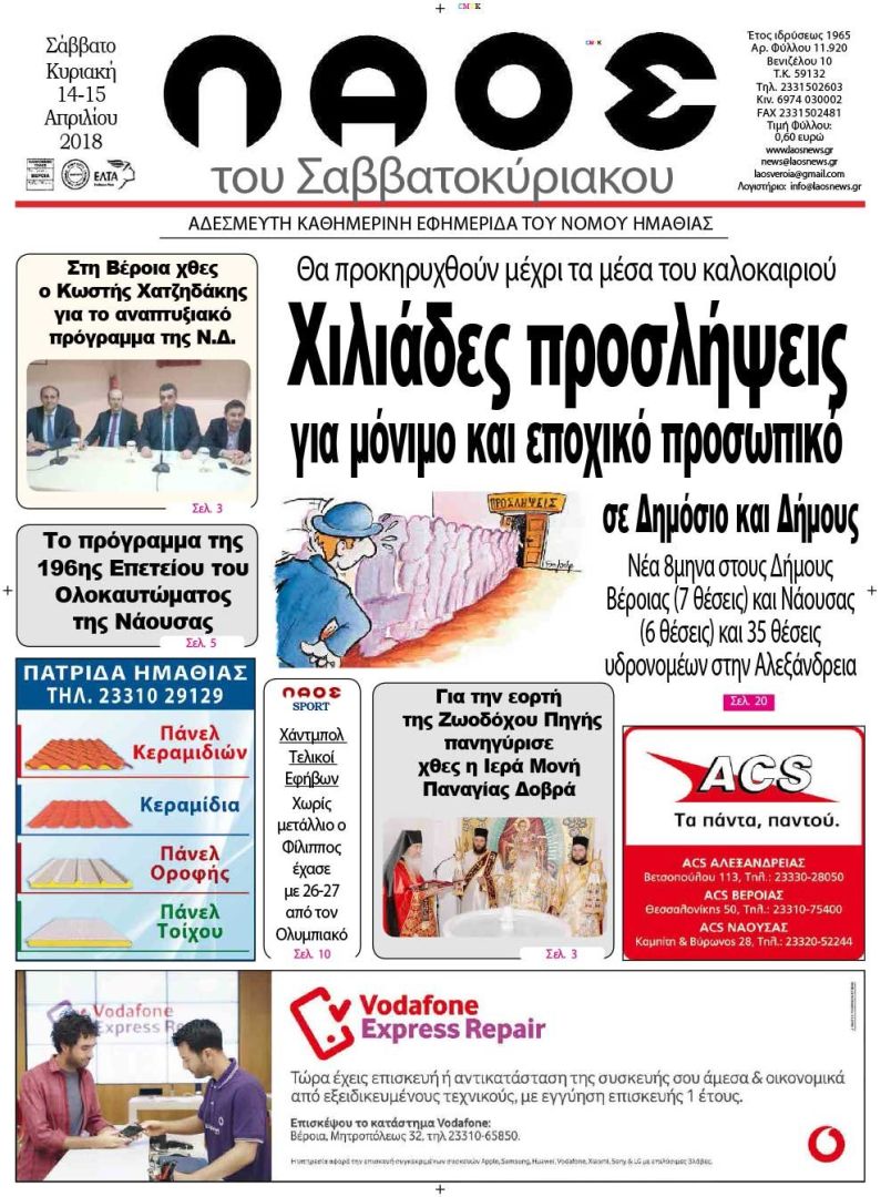 Πρωτοσέλιδο 14-15 Απριλίου 2018