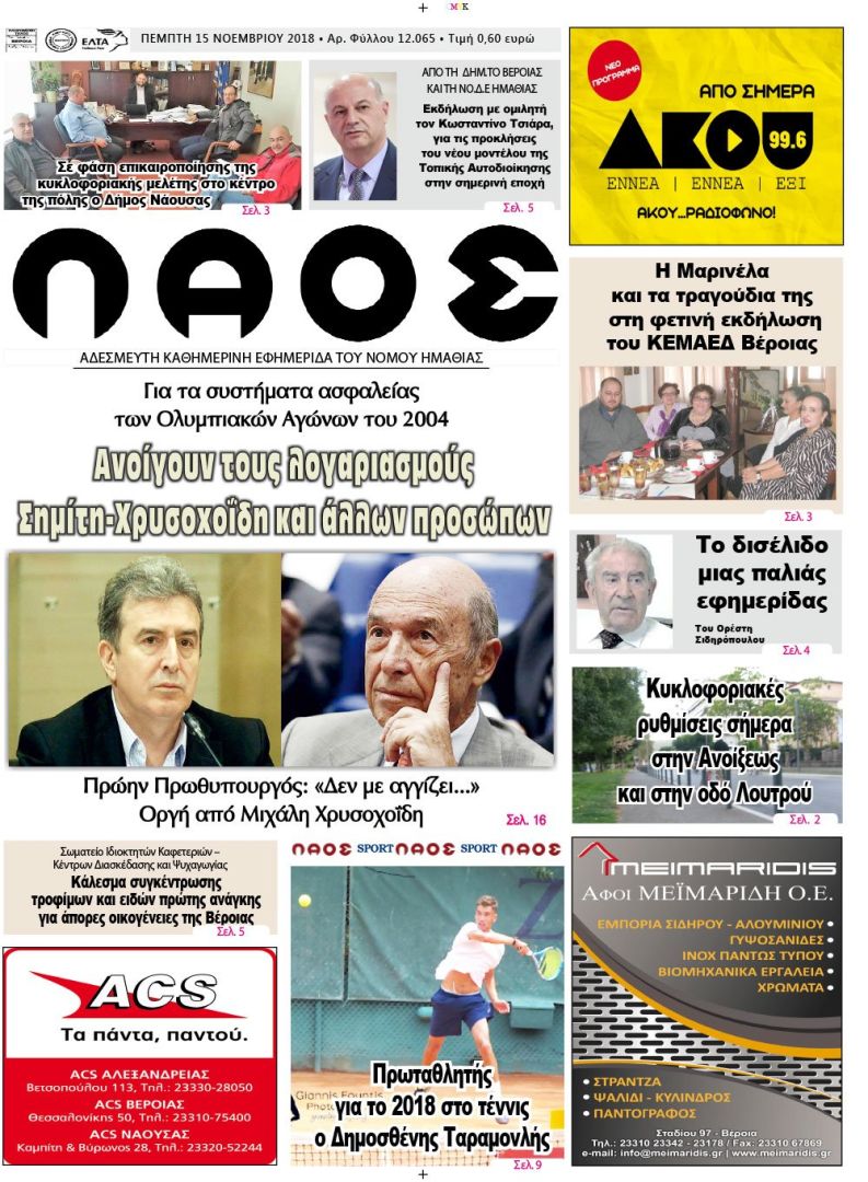 Πρωτοσέλιδο 15 Νοε. 2018