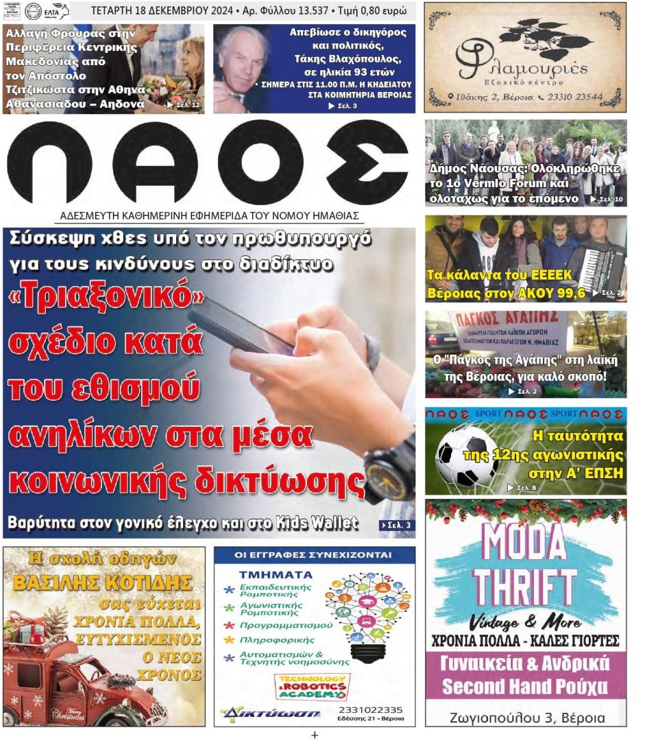 Πρωτοσέλιδο 18/12/2024