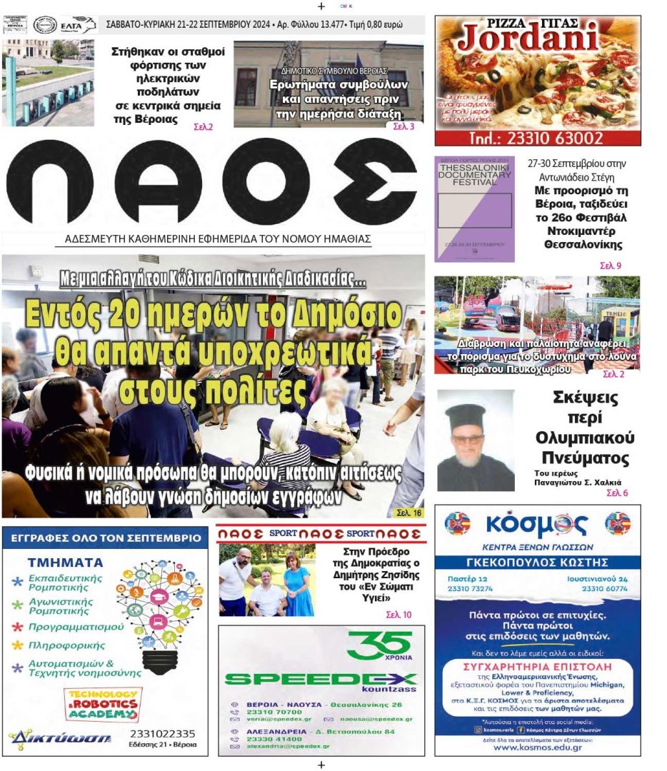 Πρωτοσέλιδο 21/9/2024