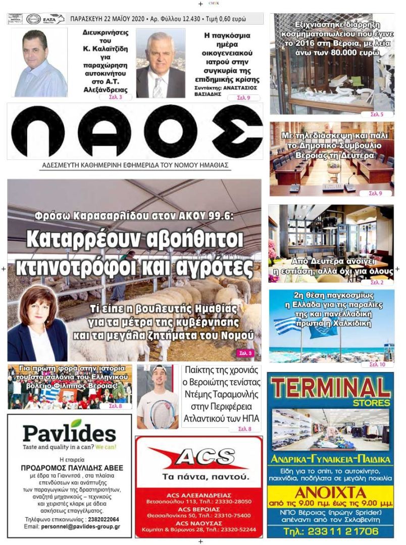 Πρωτοσέλιδο 22 Μαΐου 2020