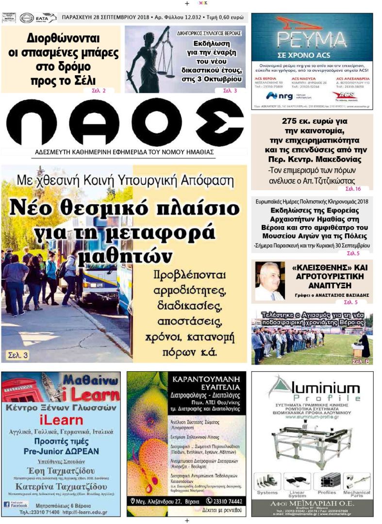Πρωτοσέλιδο 28 Σεπτεμβρίου 2018